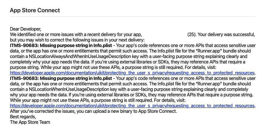 App Store Connect에 개인 정보 수집 항목에 위치 추적을 포함하지 않았고, App 내 소스 코드에서도 위치 추적 기능과 이에 대한 허용 Dialog가 노출되지 않도록 했음에도 불구하고 이러한 경고 메일을 App Store Connect가 자동으로 전송하는 경우가 있는 것 같다. 물론 Flutter 기반 iOS 앱이기에 완전한 Native 앱이 아니라는 점을 감안해야 하겠지만, 소스 코드 내에 위치 추적 허용 관련 기능을 구현하지 않았기에 이러한 경고 메일을 수신하는 것이 의아하다. 이전 버전에 위치 추적 허용 Dialog가 화면에 나타나도록 구현했었던 것으로 인해 App Store Connect가 이 부분이 누락된 것을 감지해서 경고 메일을 전송하는 것 같기도 하다. 아무튼 앱에 위치 정보 관련 수집 기능이 탑재되어 있지 않고, Info.plist의 NSLocation 관련 항목이 없는 상태에서 앱 심사 요청을 해도 심사가 통과가 되는 것을 보니 이러한 경고 메일을 무시해도 크게 지장 없는 듯 하다. 이러한 경고 메일을 받았다면 크게 당황하지 않아도 된다.