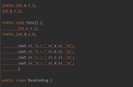 C++은 일단 컴파일 에러가 발생하는 부분이 없다. 이 말은 즉, 클래스 바깥에서 static 선언이 가능하고 이를 어떠한 함수 내에서 사용이 가능하다는 것이다. C의 특성을 가지고 있는 C++은 Java와는 다르게 static 선언을 허용하는 범위가 넓다고 볼 수 있다.