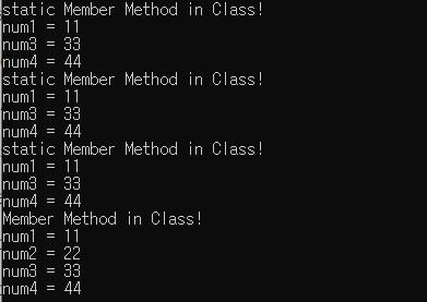 그래서 출력결과를 살펴보면 func2() 함수를 호출할 때 fun() 함수가 호출되고 나서 나머지 func2() 함수의 기능이 수행되는 것을 확인할 수 있다. static 함수도 마찬가지로 static 멤버 함수 호출을 위한 객체 생성은 메모리 관리 측면에서 비효율적이기에 주의해야 한다.