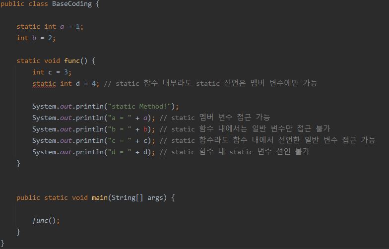 Java의 전형적인 특징인 OOP로 인해 static은 멤버 함수에 한해서만 사용이 가능하다. 그렇기에 static으로 정의된 main함수 내에서 static 멤버 함수가 호출되어 위와 같이 결과가 출력된다.